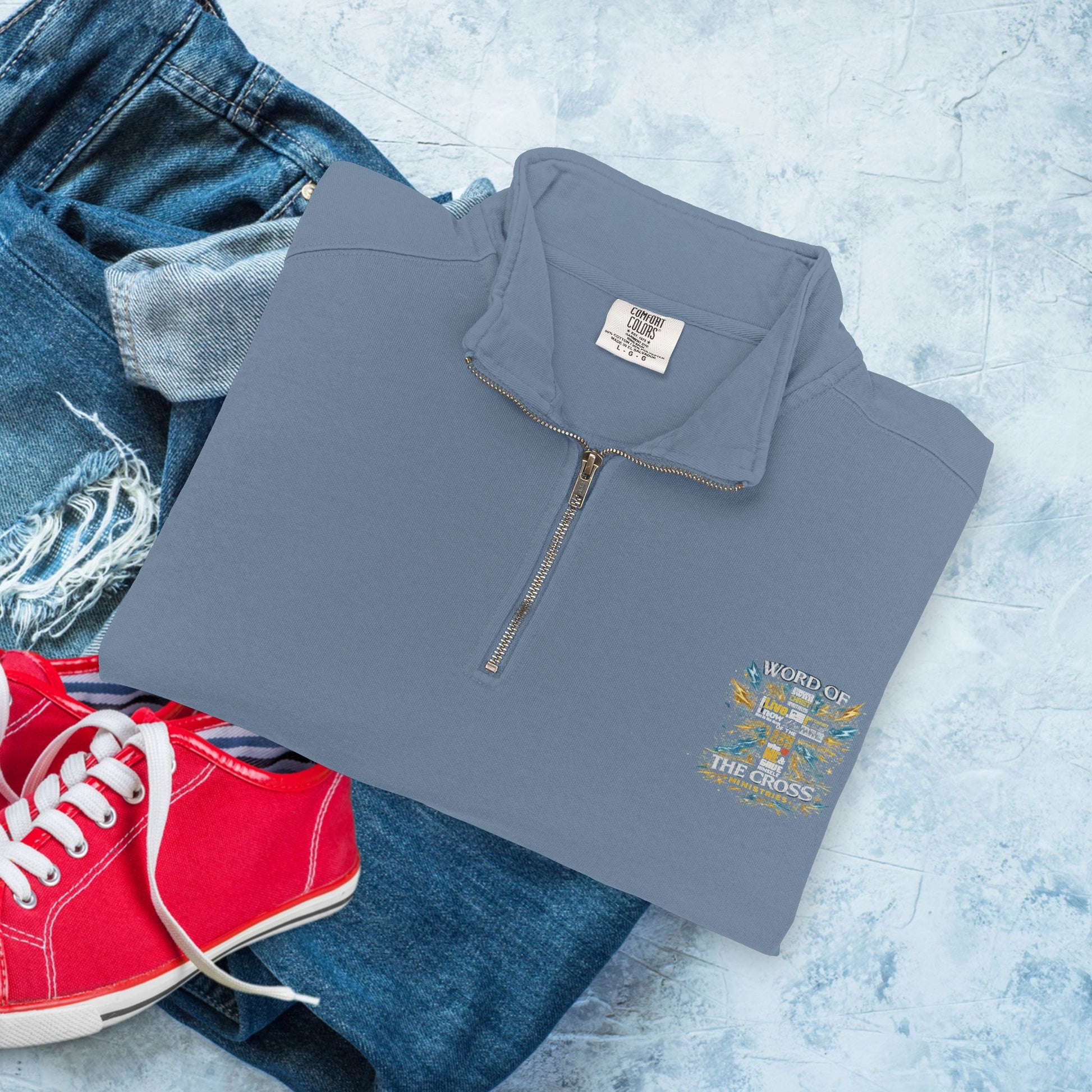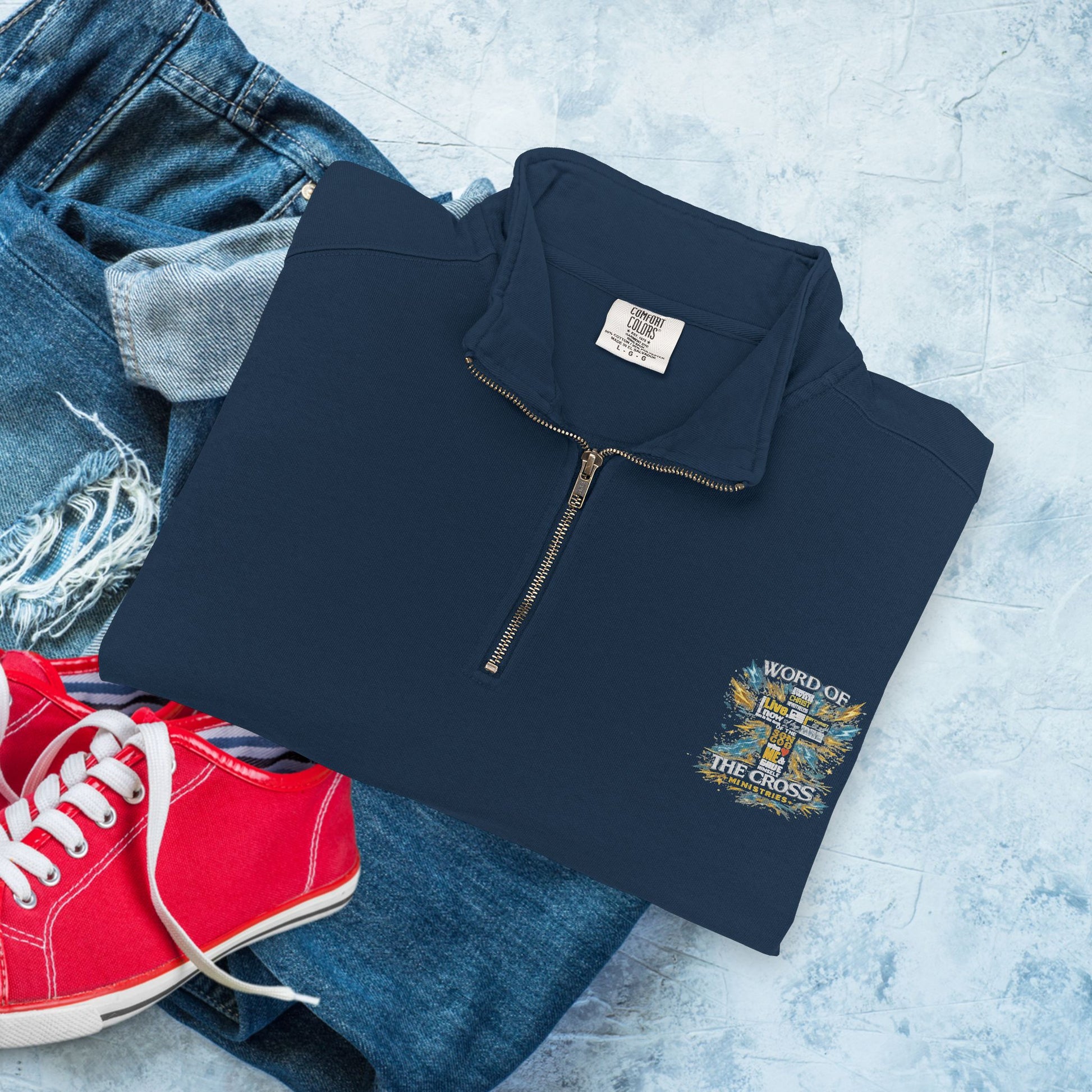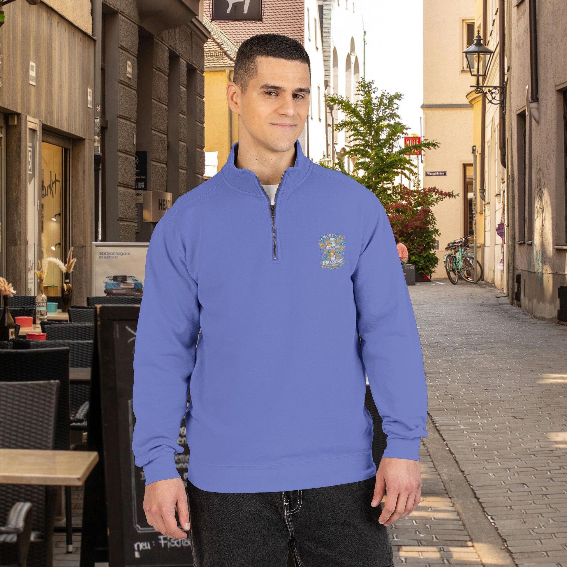 This quarter-zip sweatshirt feels like a quiet morning walk through fir trees and wet pavement. The muted charcoal color and small, stitched chest motif keep the look low-key but thoughtful — the kind of layer you grab when you want to feel put-together without trying. The heavier fabric and self-lined collar hold their shape, so the zip sits clean and the collar stands just so. Wear it on cool commutes, slow weekend afternoons at a coffee shop, or evenings around a backyard fire. It moves easily with you thanks to rolled-forward shoulders and a relaxed cut, and the ribbed cuffs and waistband snap back into place after you’ve pulled it on. Clean, responsibly dyed colors mean it’ll age with character rather than fade into flatness. This is for people who prefer quiet quality over loud logos — subtle, durable, and lived-in from the very first wear.